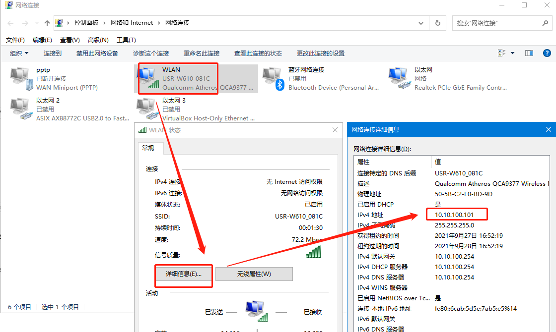 2>连接W610的wifi,连接成功后,电脑会获取到10.10.100.xx网段的IP地址