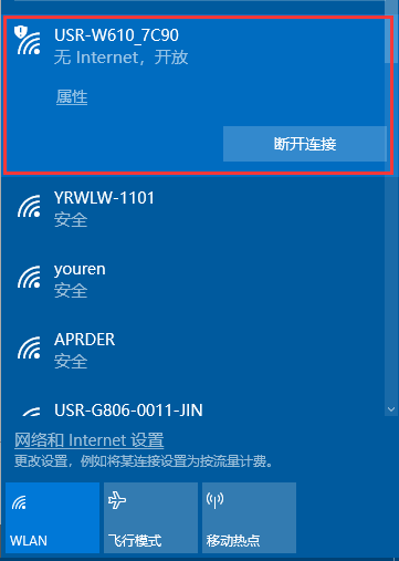 1、电脑打开无线网络连接,搜索网络,如下图的“USR-W610_xxxx”(xxxx 是 MAC 地址后四位)即是模块的默认网络名称(SSID)。电脑关闭防火墙与杀毒软件并禁用除了wifi之外其他的网卡。