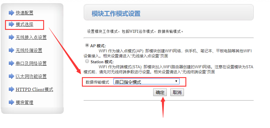 2、电脑浏览器地址栏输入模块默认IP:10.10.100.254,账号和密码都是admin,进入内置网页,模式选择 -> 数据传输模式 -> 串口指令模式,点击确定,串口及网络设置 -> 网络参数设置 -> 网络模式配置为client,点击确定,重启模块。