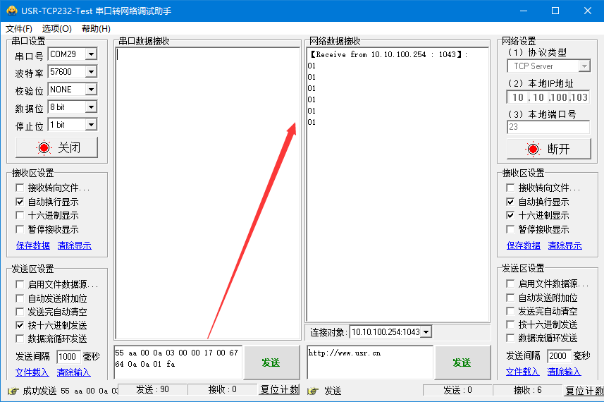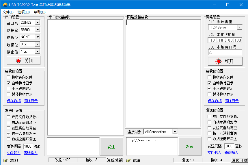 TCP232-TEST串口及网络调试助手软件:https://www.usr.cn/Download/27.html