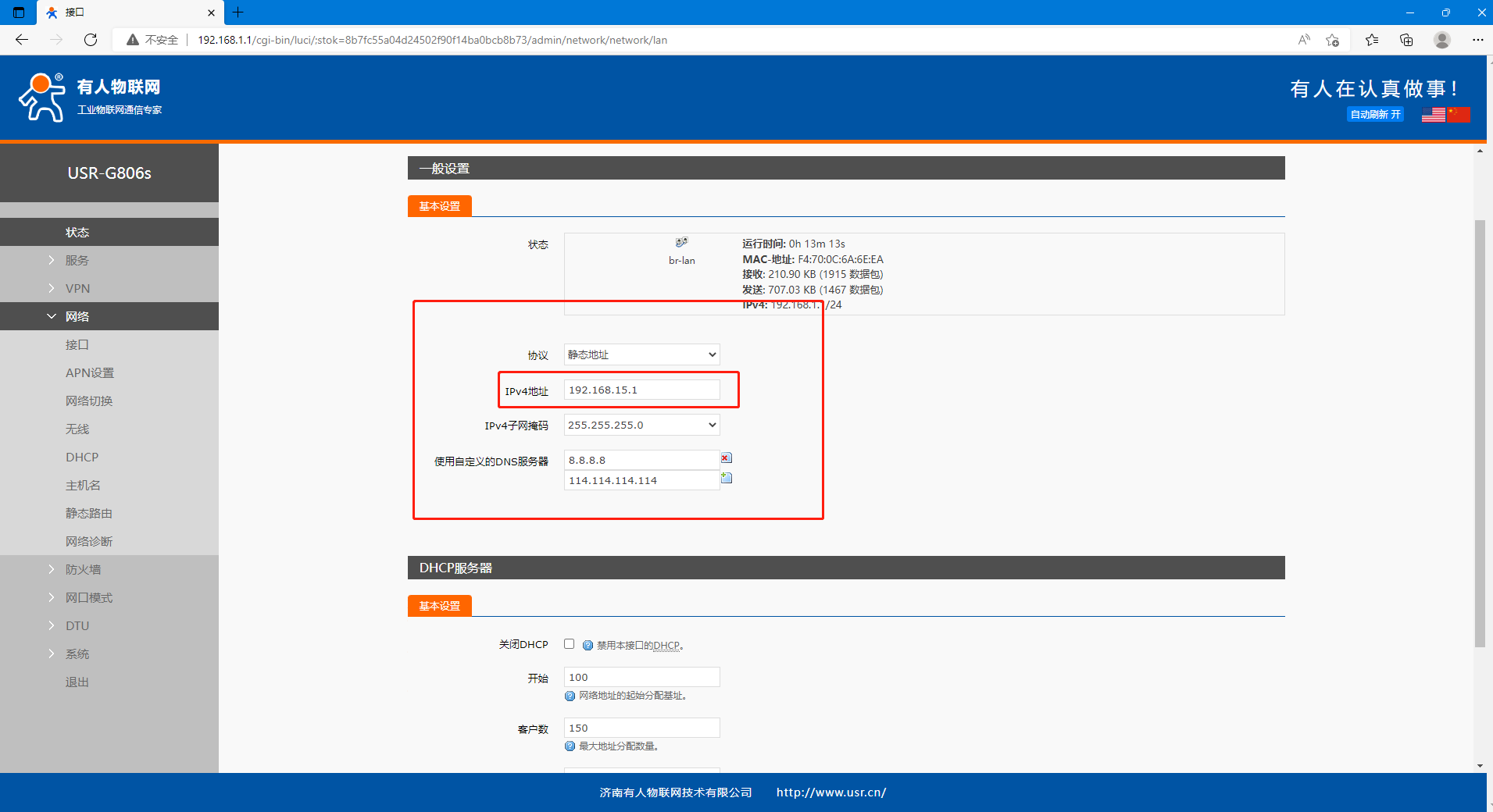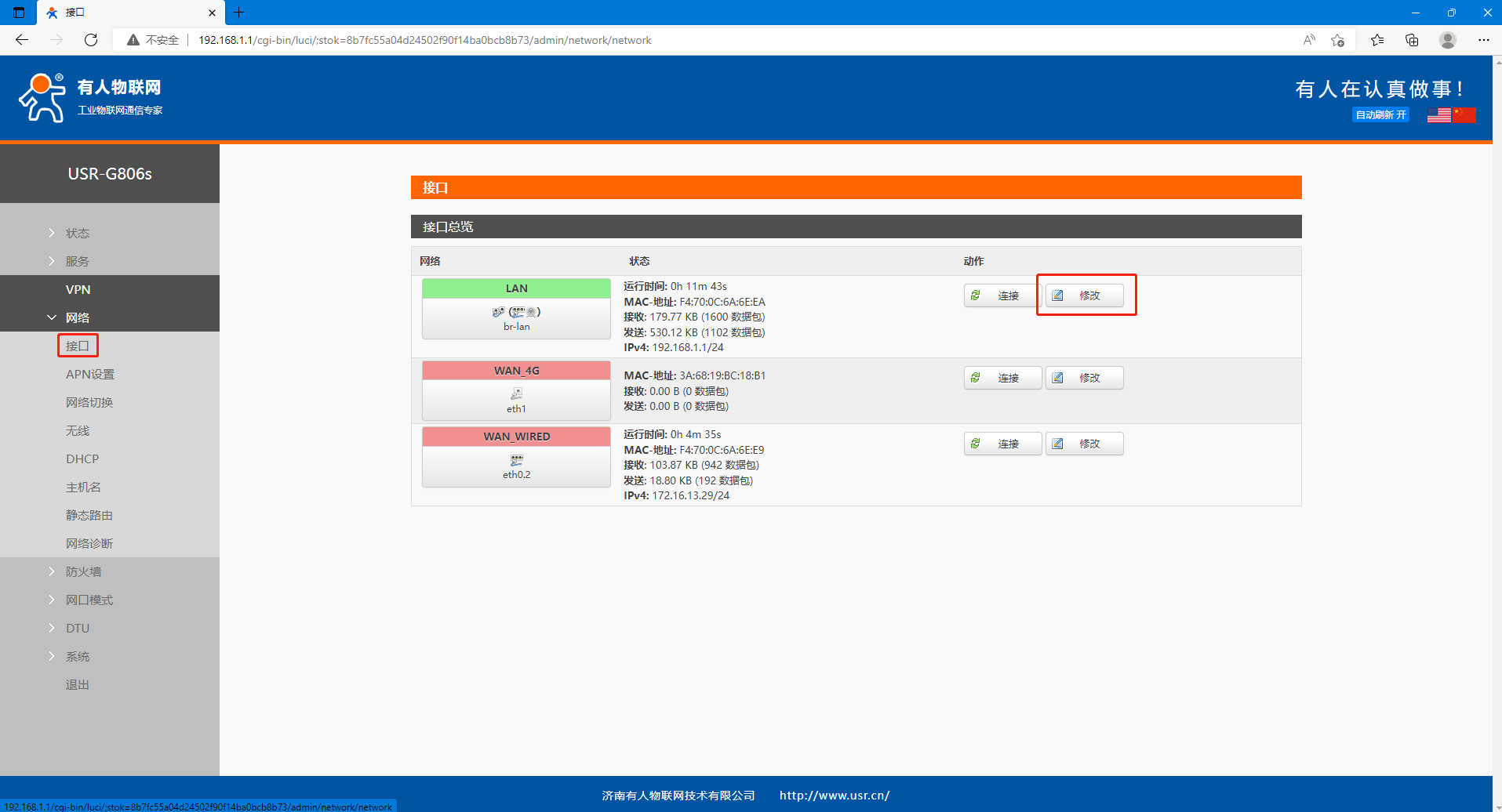 3.进入 进入配置网页后,点击接口---修改,默认IP地址192.168.1.1,修改为所需要的网段,如下图所示,可修改IP地址 为192.168.15.1。