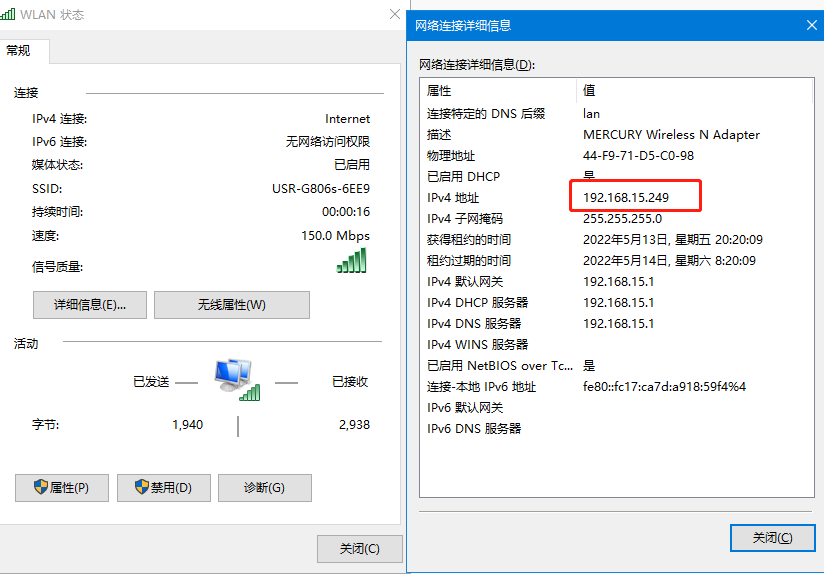 5. 待设备重启成功后,重新查看电脑获取的IP,变成192.168.15.249,网关为192.168.15.1,浏览器输入192.168.15.1进入配置网页。