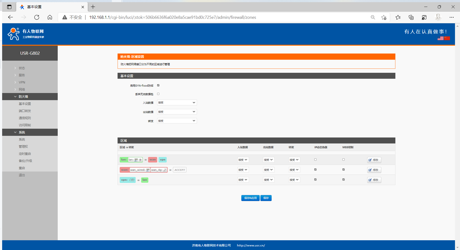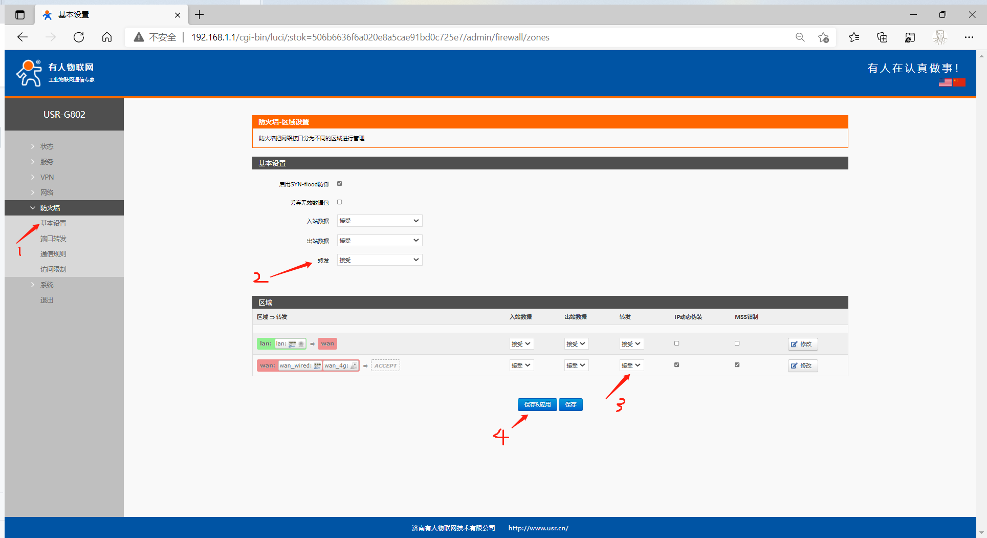 点击保存并应用,然后点击防火墙-->基本设置,如下图