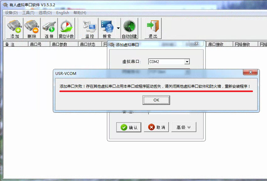 虚拟串口软件,添加虚拟串口失败问题