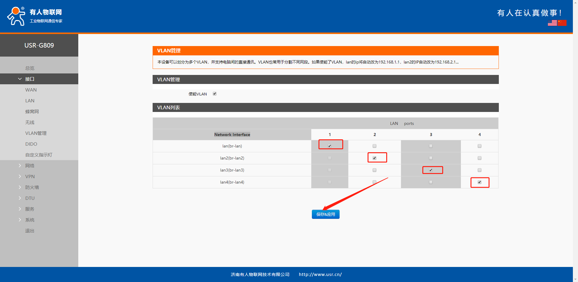 功能介绍:G809 支持 4LAN 口划分多个 VLAN,支持划分 VLAN 互相通讯,如果使能 VLAN,LAN 口 IP 将自动改为 192.168.1.1,LAN2 改为 192.168.2.1 以此类推