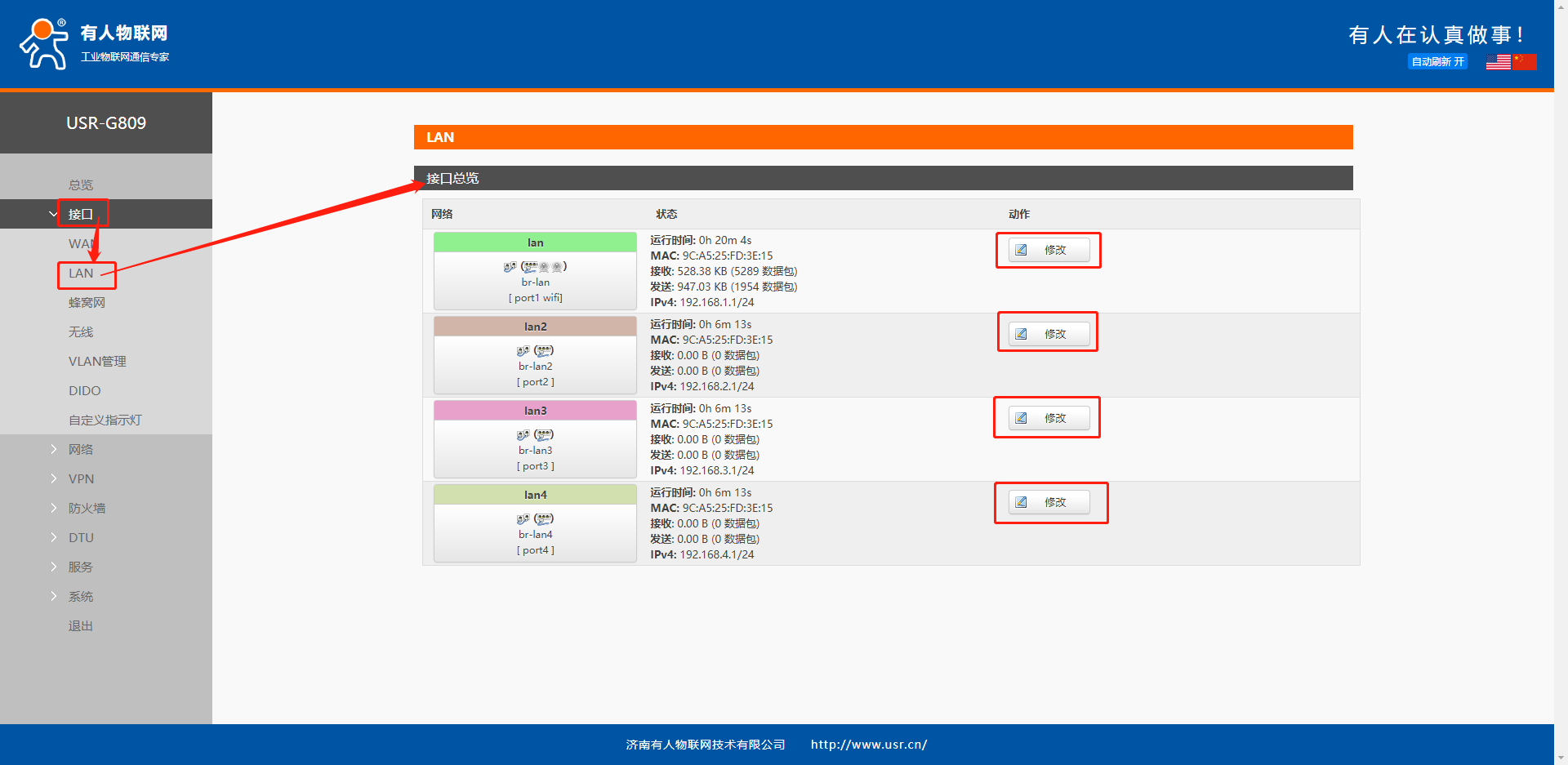 8、点击对应接口后方的修改,即可修改该接口的网段。要注意,若设备WAN口(包括WAN_4G和WAN_WIRED)已有IP,则LAN口(包括LAN1-4)IP不能与WAN口一致。参数全部修改完成后点击下方保存并应用。此处以LAN接口为例进行设置,其余几个LAN口设置方式一致