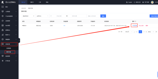 (3)在有人云的“设备运维”--“固件升级”界面可以看到所有进行升级的任务,升级详情中查看当前固件升级进度