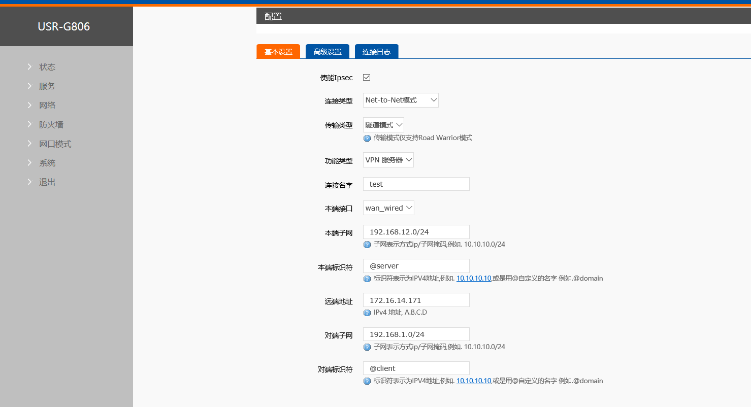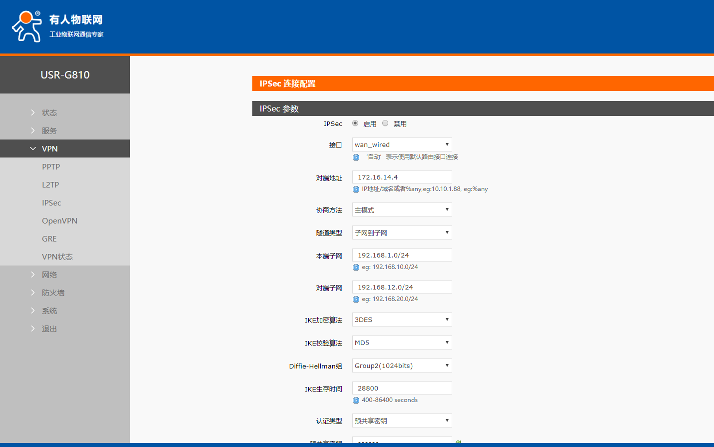USR-G810与USR-G806搭建IPSEC子网对子网模式通信测试