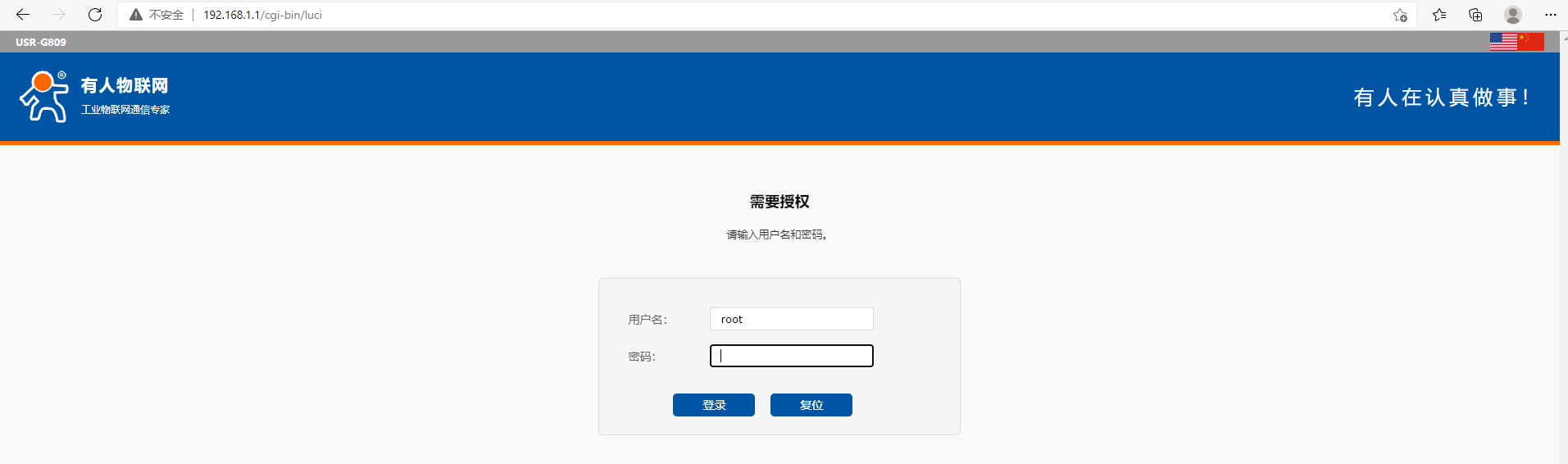 2、登录内置网页:打开浏览器,输入G809出厂默认IP:192.168.1.1,用户名以及密码均为root