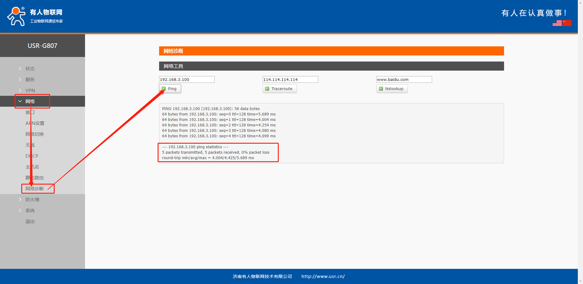 8、进入之后在网络--网络诊断界面ping一下电脑IP:192.168.3.100,能通也说明网络是通的