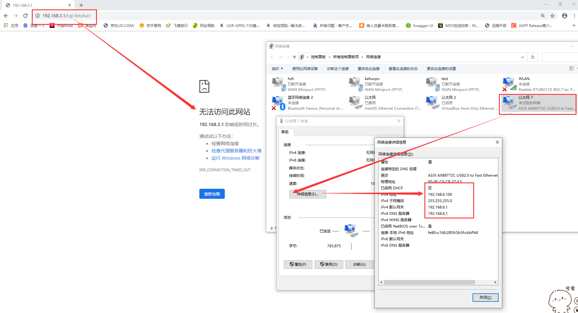 7、可以看到此刻电脑可以通过该网卡上网,也就说明网络通了。再次进入设备的内置网页,因为设备LAN IP此时为192.168.3.1,需要用修改后的IP进入