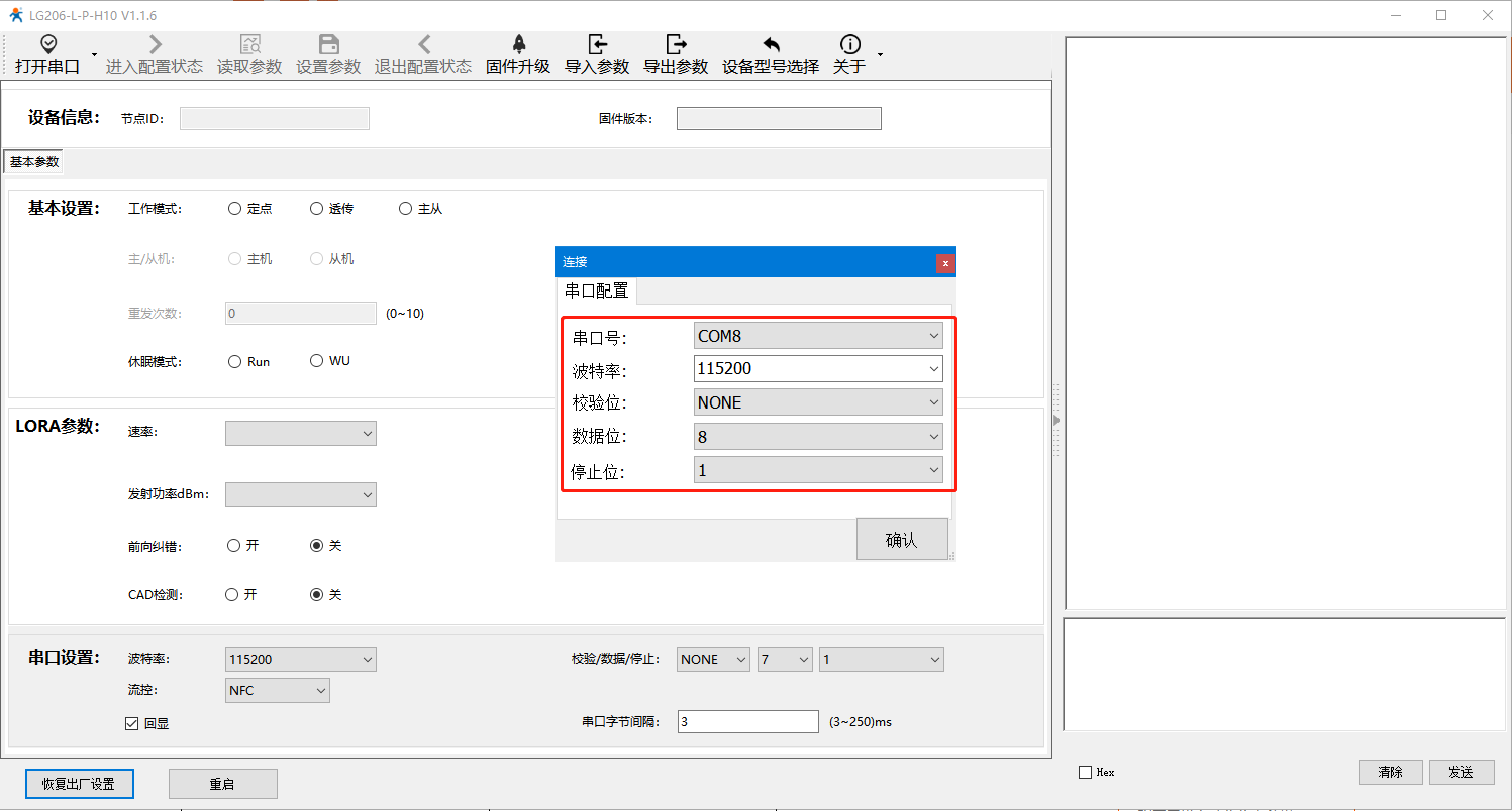 2>LG206出厂默认串口参数是115200,N,8,1的串口参数,如果修改过串口参数的话,用选择修改后的参数;如果忘记了串口参数,就将LG206硬件恢复出厂设置