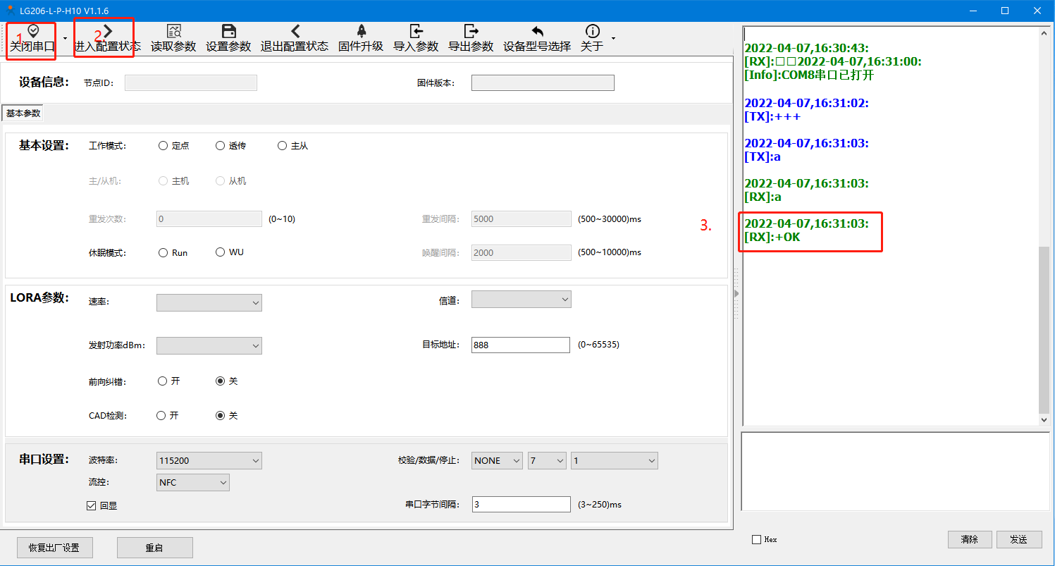 5. 进入配置状态:打开串口---进入配置状态,收到+ok说明进入配置状态成功,否则失败。进入配置状态失败,则无法正常进行参数配置了。