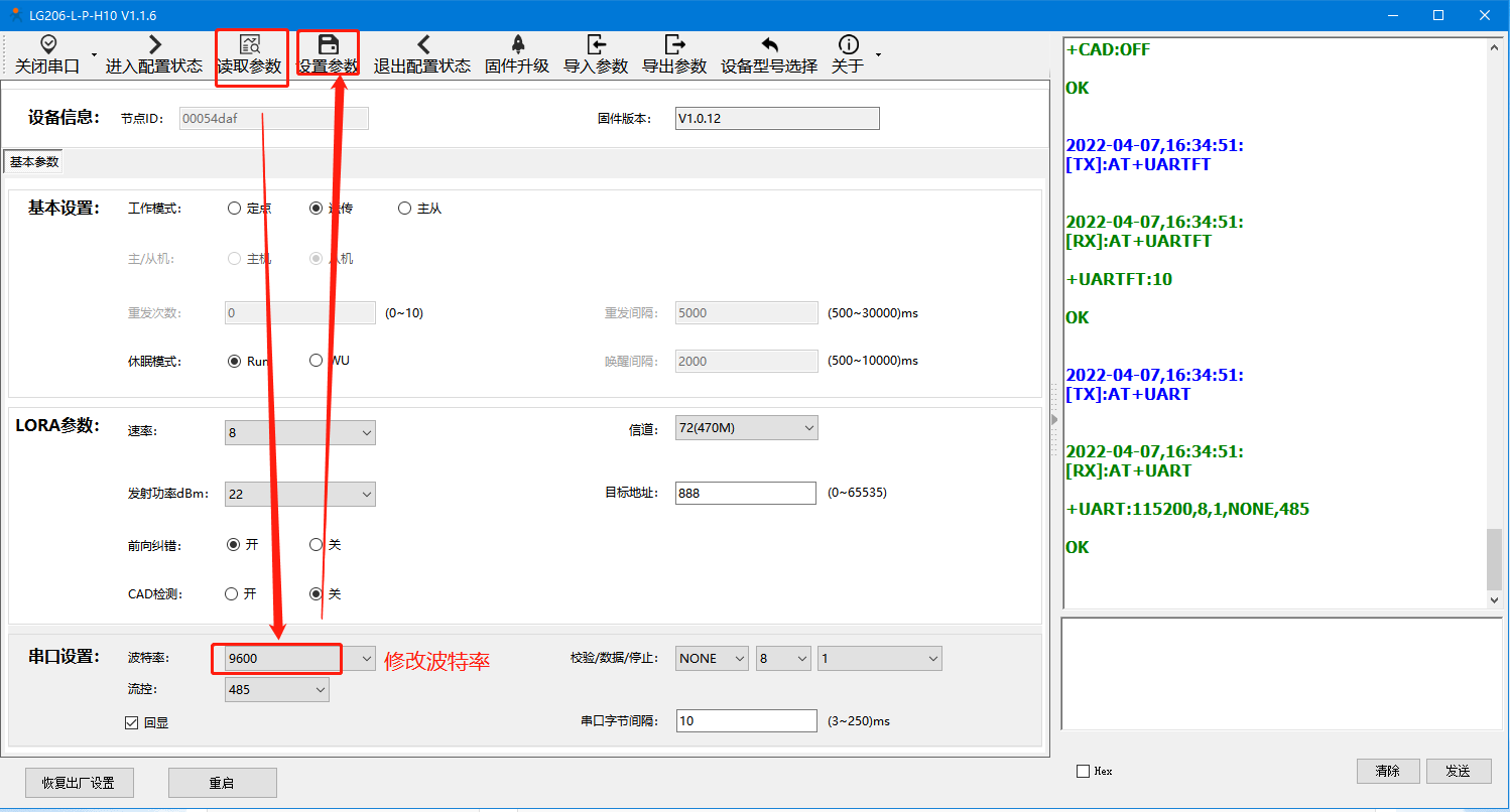 点击读取参数:可以获取到lora模块目前的参数设置