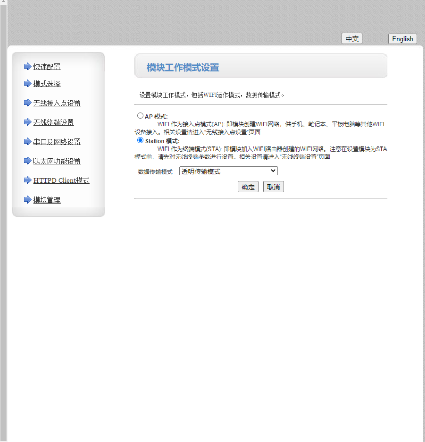 1、登录之后,在模式选择中,将USR-W610的工作模式从默认AP模式改为STA模式,点击确定,会跳出重启提示,建议不要立刻重启,需要所有网页参数设置完毕之后,最后再重启USR-W610。