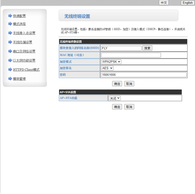 2、在无线终端设置中,模块要接入的网络名称SSID,可以手动输入USR-W610设置STA模式要连接路由器wifi的名称,选择加密模式和加密算法,输入路由器的wifi密码。点击确定。最后重启USR-W610。