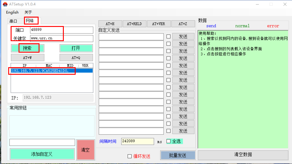1、USR-W610设置STA模式连接路由器后,电脑连接同一个路由器,关闭防火墙,禁用其他网卡。电脑下载打开ATSetup V1.0.4 设置软件,切换中文显示,点击网络,端口用48899,关键字用www.usr.cn,点击搜索,可以显示路由器给USR-W610分配的IP。