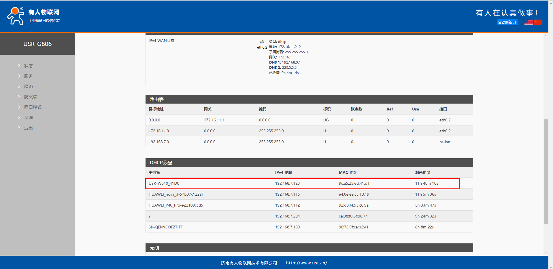 2、也可以登录路由器内置网页DHCP列表查看路由器给USR-W610分配的IP。