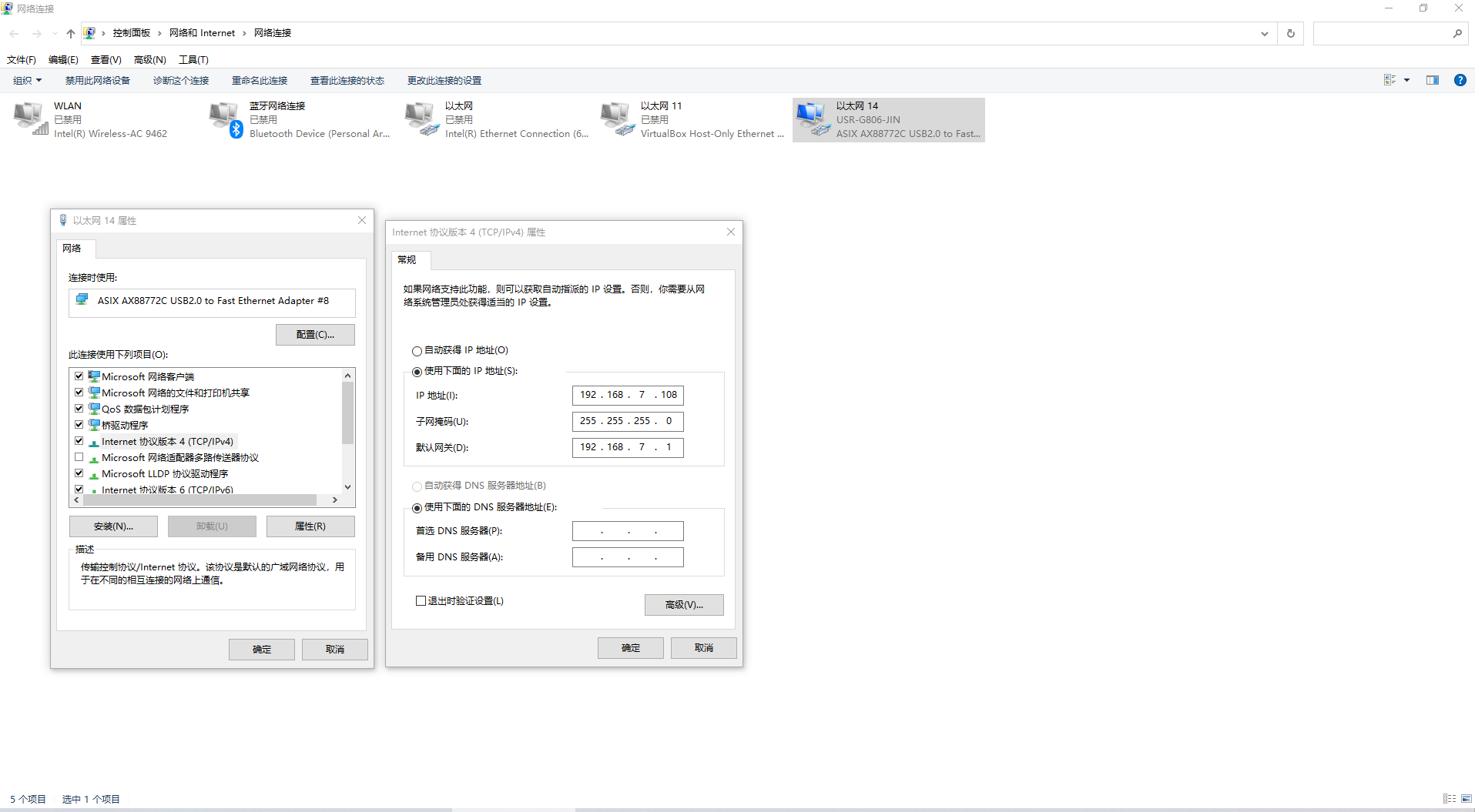 2、第二台电脑用网线接路由器网口,本地连接设置DHCP获取IP,动态获取的IP是192.168.7.108。将本地连接DHCP改为静态IP,IP:192.168.7.108,子网掩码:255.255.255.0,网关:192.168.7.1。第二台电脑关闭防火墙,禁用其他网卡。