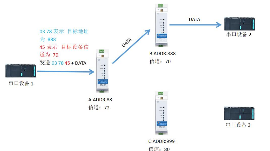 LoRa 数传终端 A(目标地址(ADDR):88,信道(CH):72)想向另一台 LoRa 数传终端 B(目标地址 (ADDR):888,信道(CH):70)发送数据 DATA(123456),则只需要按照 16 进制发送(03 78 46 31 32 33 34 35 36),则 LoRa 数传终端 B 接收到数据(31 32 33 34 35 36)。
