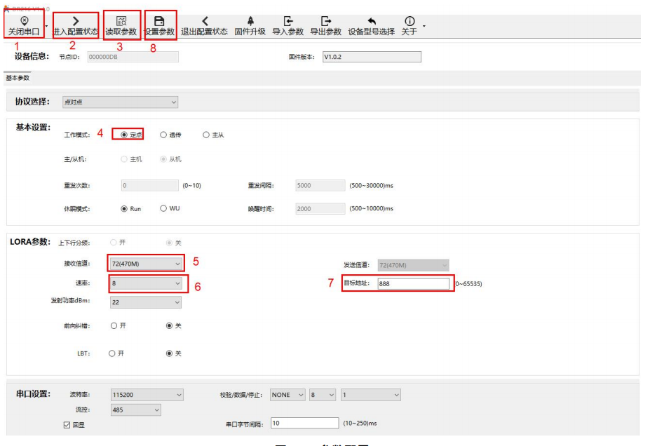 打开LoRa设置软件→ 选择DR216 → 依次点击打开串口(选择A对应的串口号,串口参数:115200,None,8,1,NFC) → 进入配置状态 → 读取参数 → 配置参数 (设备A:定点模式,速率8,信道72,目标地址88)→ 设置所有参数 → 关闭串口。