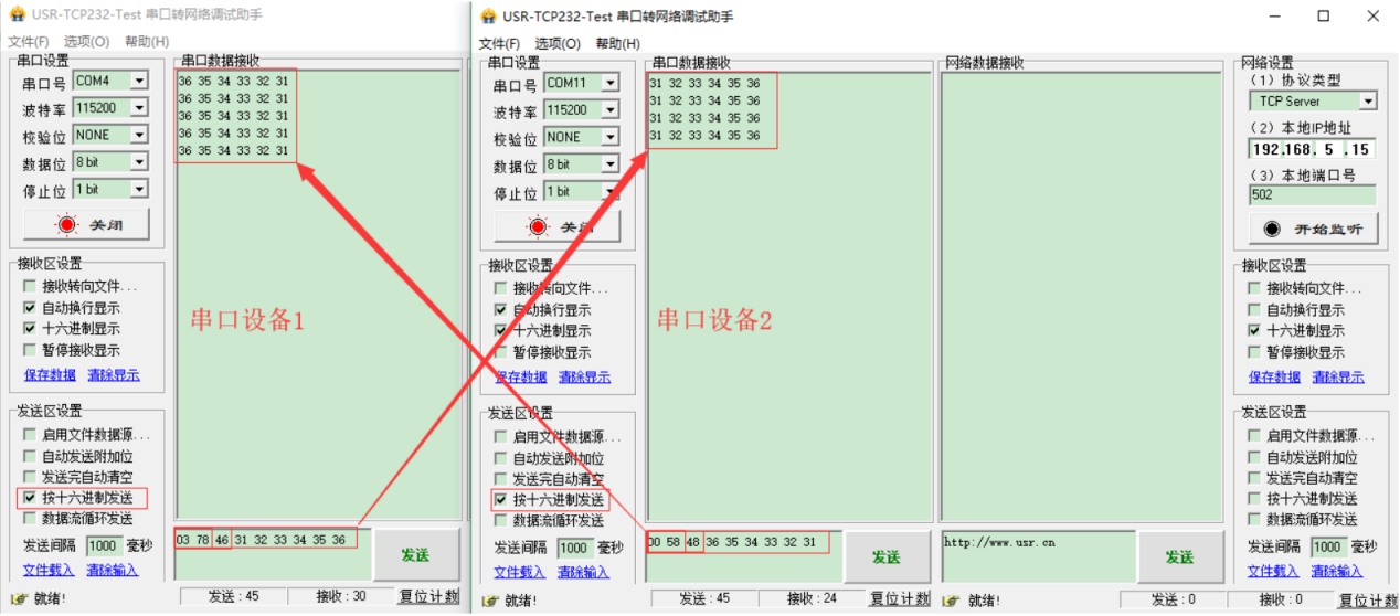 启动两个USR-TCP232-Test(模拟串口设备1,2)分别连接LoRa数传终端A、B的串口,使用串口设备1发送数据串口设备2可接收数据(反之亦然)。