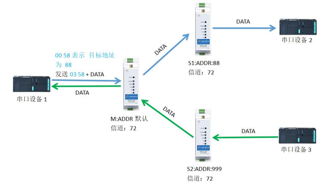 当一台主机 M(目标地址(ADDR):默认)向一台从机 S1(目标地址(ADDR):88)发送数据 DATA(123456), 则只需要按照 16 进制发送(00 58 31 32 33 34 35 36),则从机 S1 接收到数据(31 32 33 34 35 36);从机 S2 向主机 M 直接发送 DATA(31 32 33 34 35 36),主机 M 收到数据 DATA(31 32 33 34 35 36)。通信过程如下图所示: