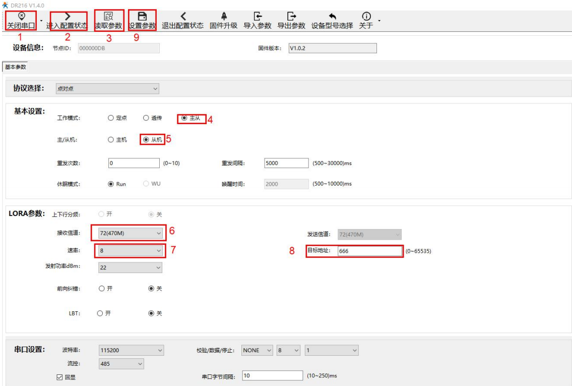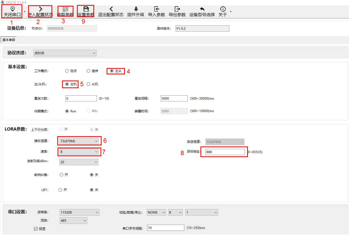 打开LoRa设置软件,选择LG216,依次点击打开串口(选择A、B对应的串口号,串口参数:115200,None,8,1,NFC)、进入配置状态、读取参数、配置上表中的参数、一键设置所有参数,关闭LoRa设置软件。