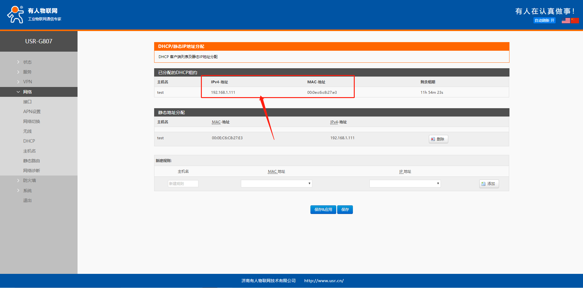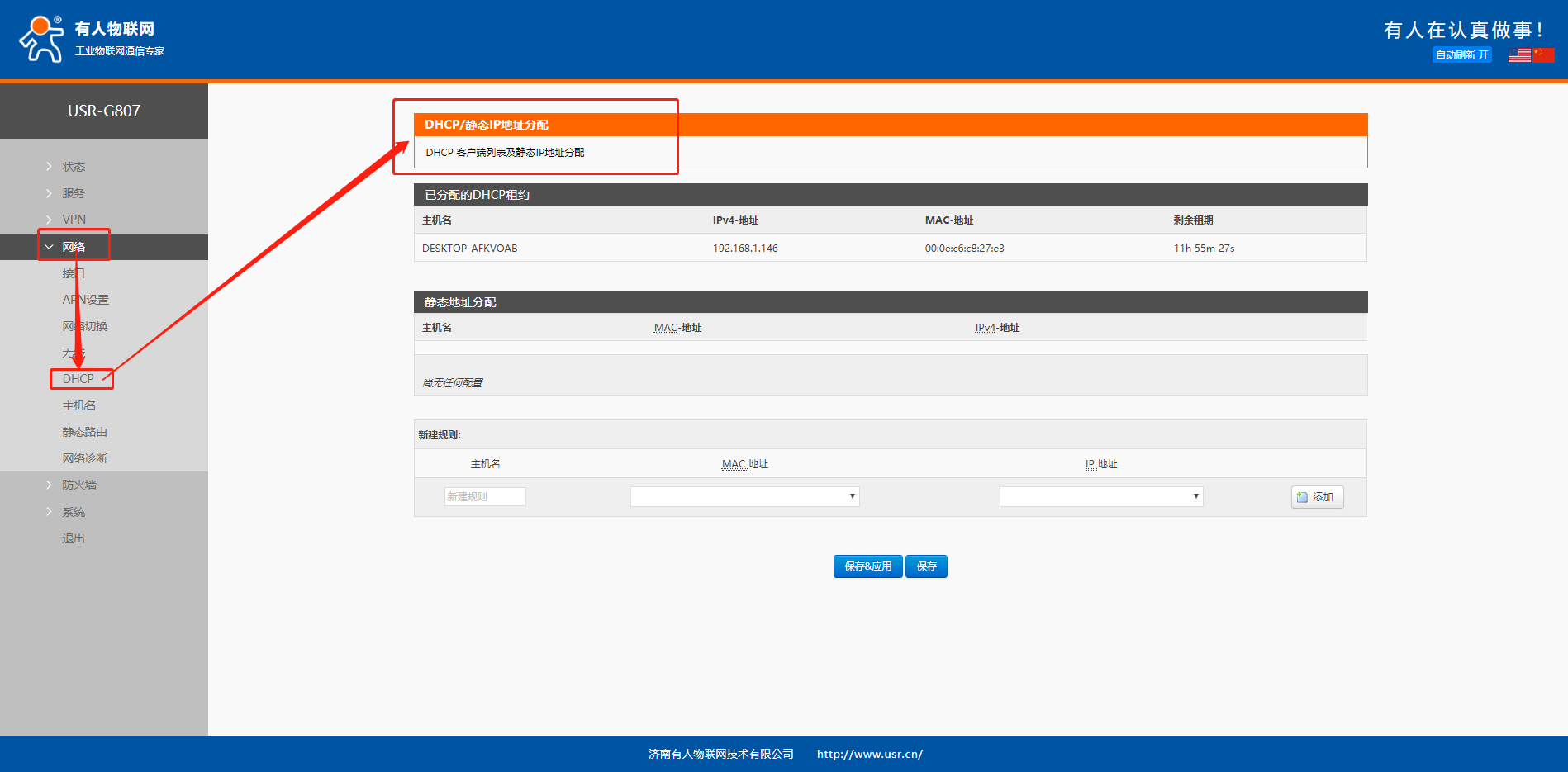 然后点击保存并应用(若不知道设备MAC,且之前设备是DHCP接入G807,可以在该界面上已分配的DHCP租约看到设备的接入信息)