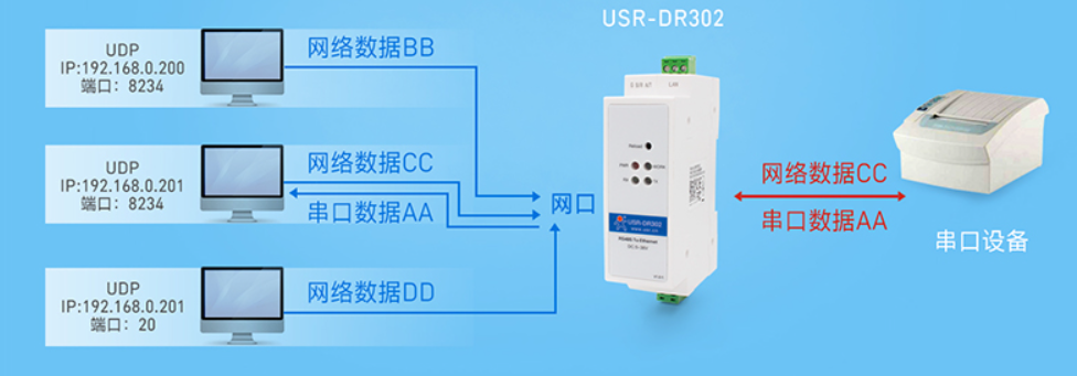 (2)DR302做udp server,将接收到的数据自动发送至上一次通讯的网络目标,适合多网络设备均需与DR302通信的传输场景使用。