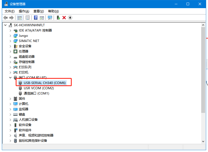 找到设备管理器,点击端口,确认USB-RS485串口线的COM口号,有人测试电脑是COM6