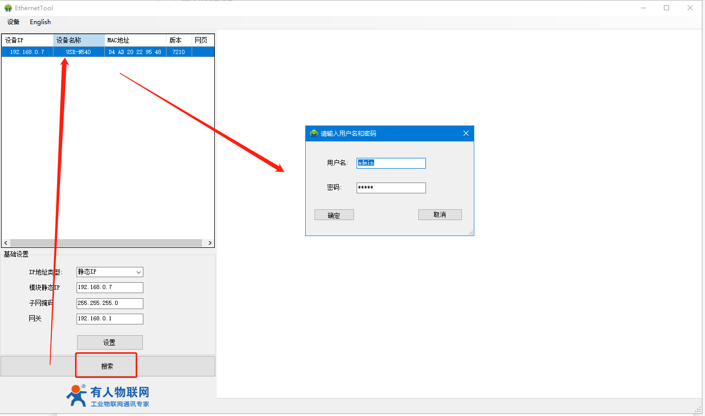 用H7系列配置软件搜索N540设备,单击搜索,找到设备之后,单击产品名称信息弹出输入用户名admin和密码admin,点击确定。在右上角点击中英文切换