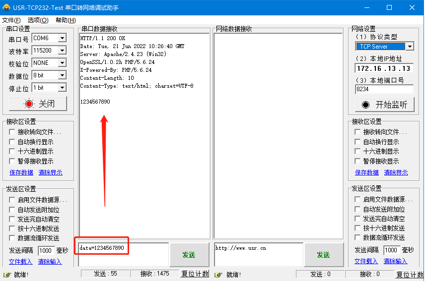 打开串口网络助手,串口参数和N540 端口1参数保持一致,串口发送数据data=1234567890,测试服务器返回数据。