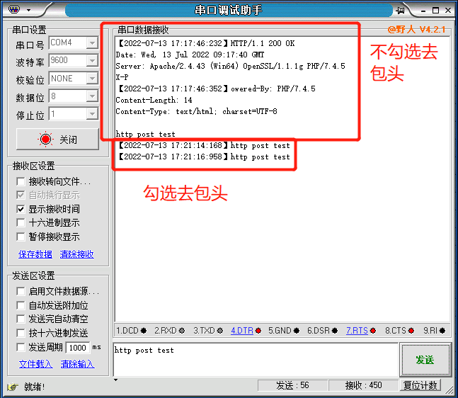 4. 数据测试:我司测试服务器的功能就是:串口发送数据给服务器,服务器将数据原封不动的返回