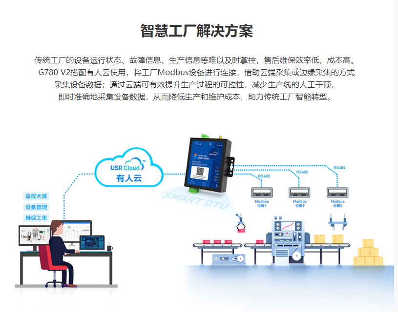 G780 V2搭配有人云使用,将工厂Modbus设备进行连接,借助云端采集或边缘采集的方式采集设备数据;通过云端可有效提升生产过程的可控性,减少生产线的人工干预,即时准确的采集设备数据,从而降低生产和维护成本,助力传统工厂智能转型