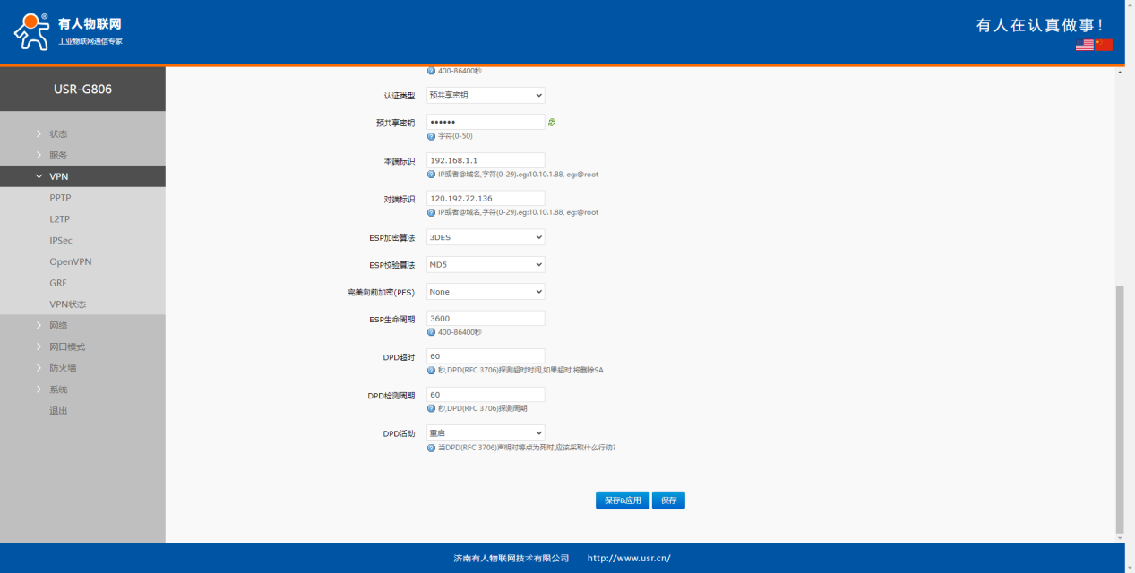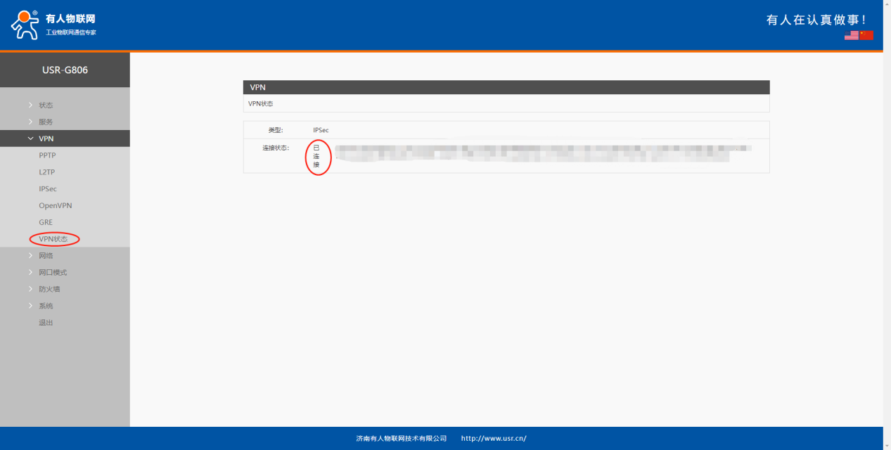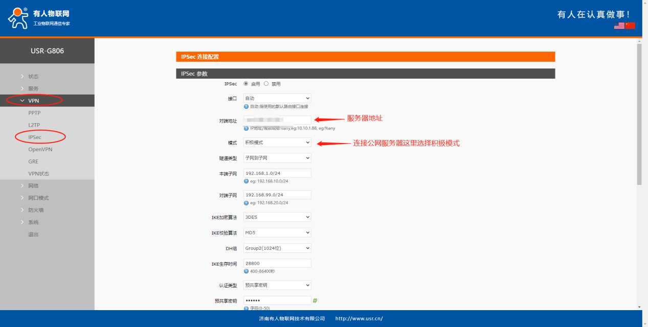 USR-G806:采用 4G 接口连接外网,启用IPsec连接 VPN。