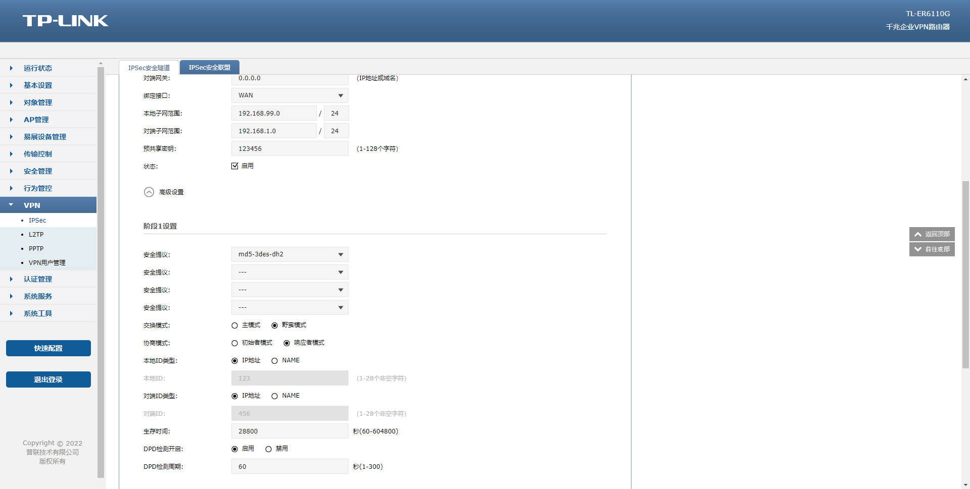本地子网范围和对端子网范围与G806端设置相对应。