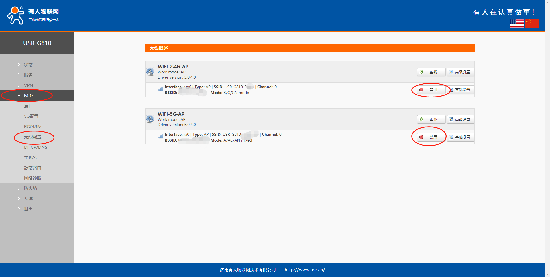 G817、G816w:网络--无线--2.4G配置/5.8G配置--启用(取消勾选)--应用