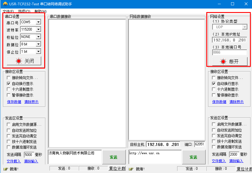 网络协议配置为UDP server,本地IP地址为192.168.0.201,本地端口号自定义设置(8866),点击开启监听,打开真实串口COM5。