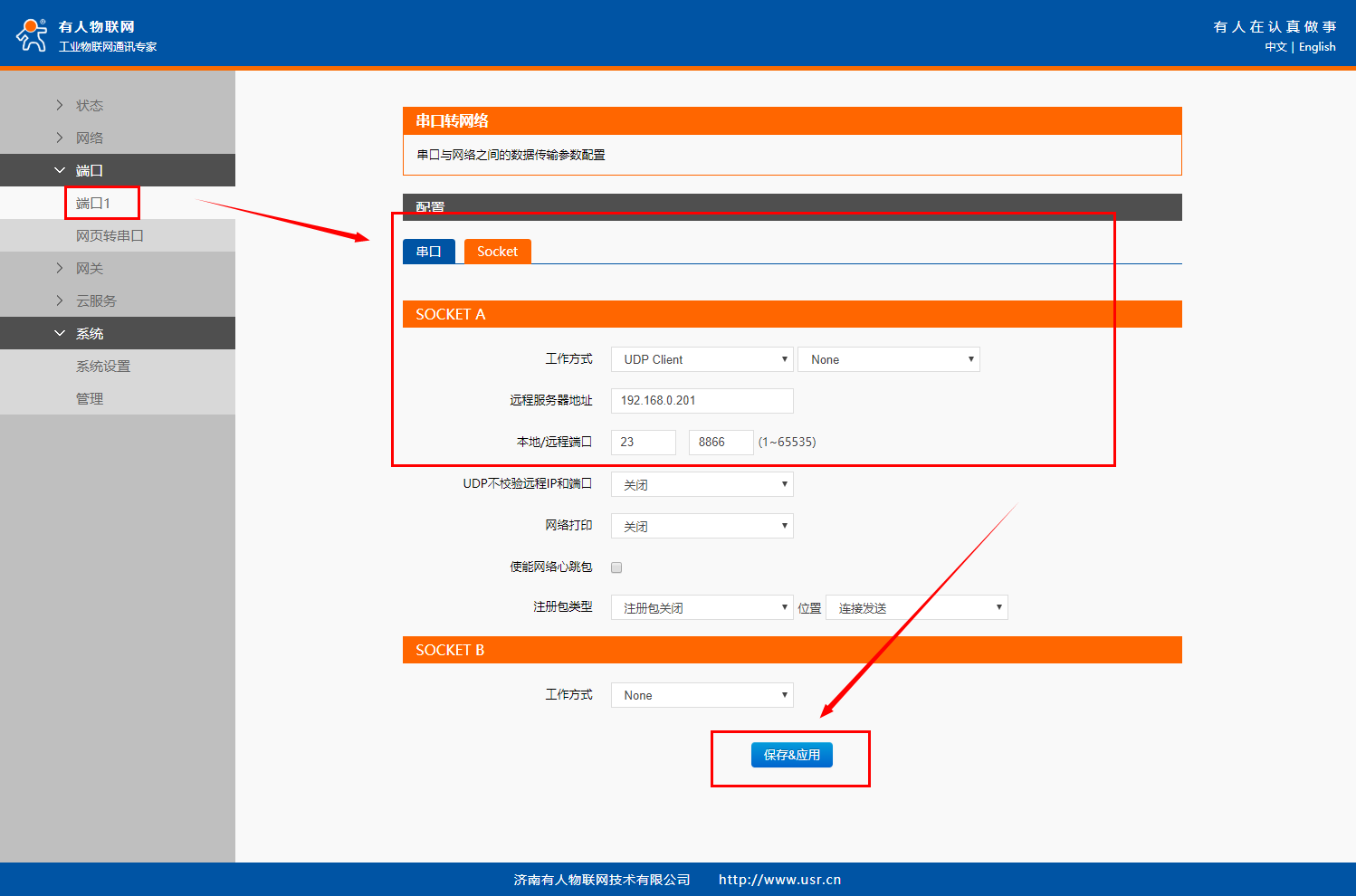 在“端口”>“端口1”界面中的“Socet”配置Socket A的工作模式为“UDP Client”
