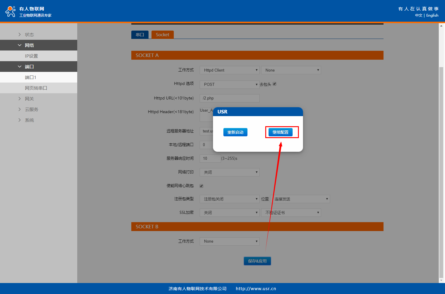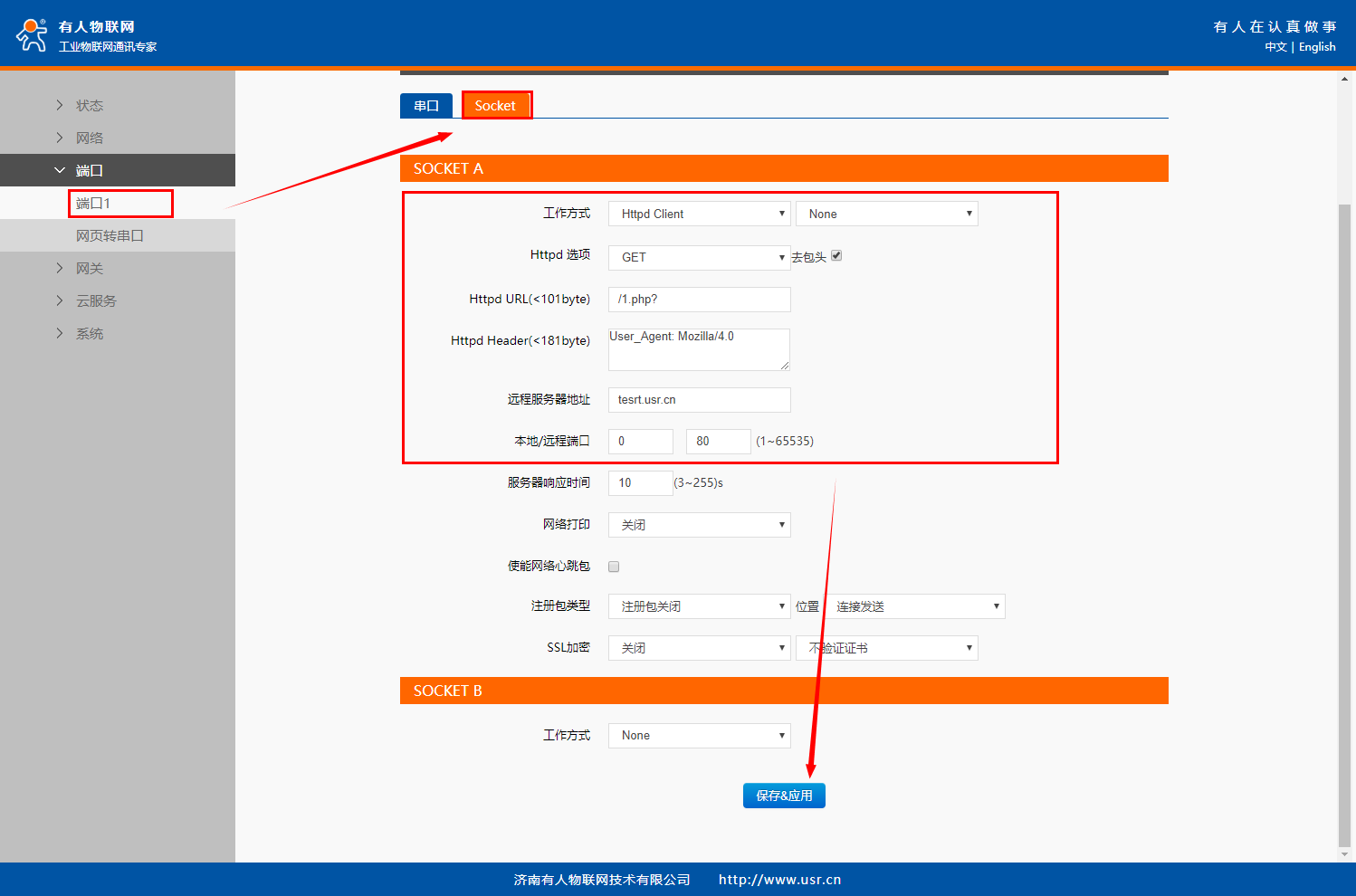 在“端口”>“端口1”界面中的“Socet”配置Socket A的工作模式为“Httpd Clinet”