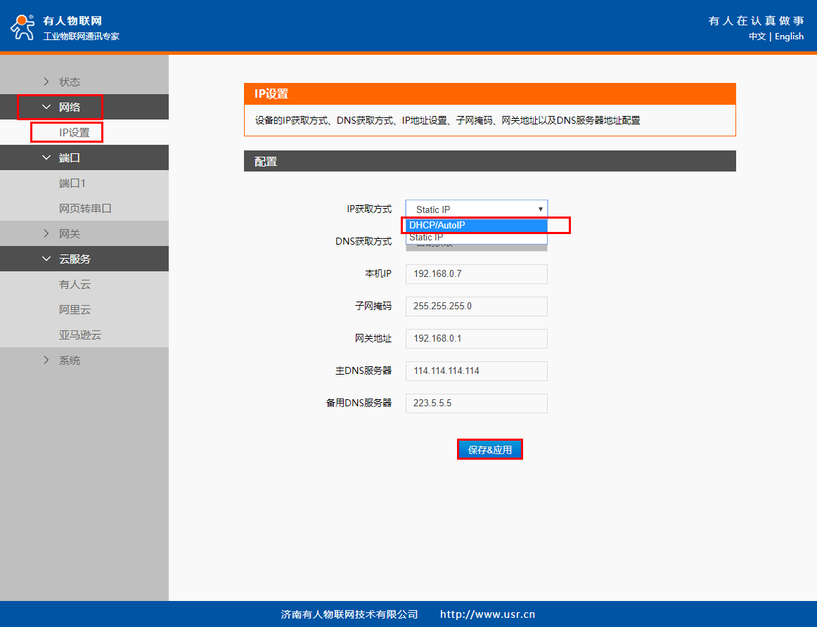 9、N510在“网络”>“IP设置”界面中配置本机ip设置中,可以配置DHCP自动获取或者设置静态ip, 本案例配置为DHCP自动获取IP,若需要配置510静态IP上网的话可以自行设置静态ip(Static IP)。