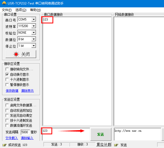 11、N510用485转usb串口线接电脑,用串口调试助手打开,串口发送123,服务器回复123。