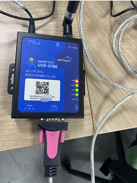 1.将780(USR-G780 V2,简称 780)的串口通过串口线(或USB 转串口线)与PC相连接,电脑识别出来一个com口,com14,插上4G卡(注意:插的是能够发送短信的手机卡),接入我们配送的电源适配器,给设备供电。