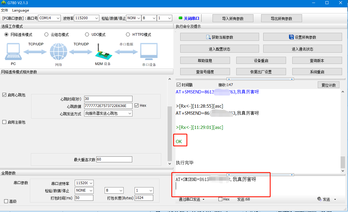 USR-G780 V2 以AT指令格式向手机发送短信