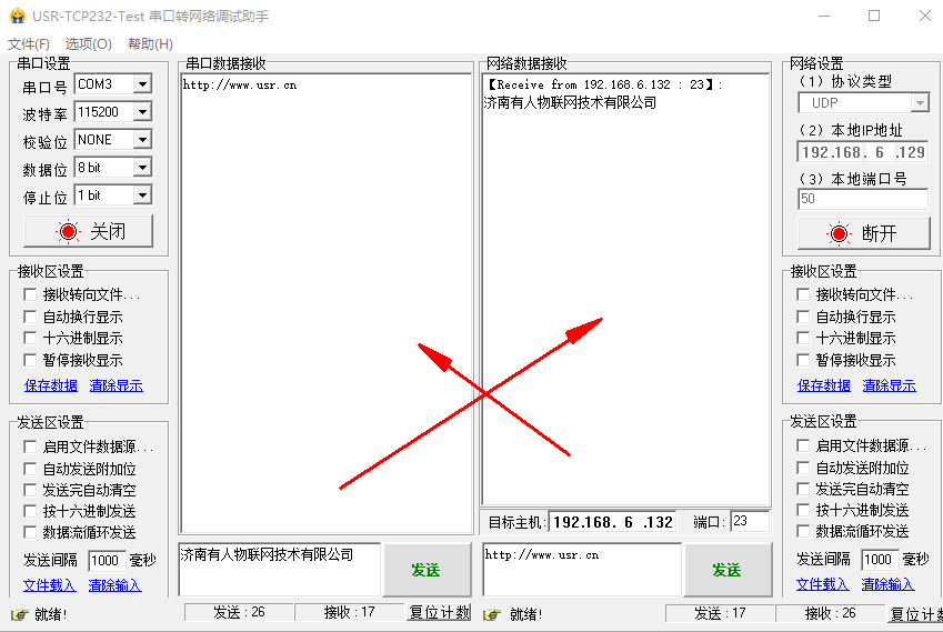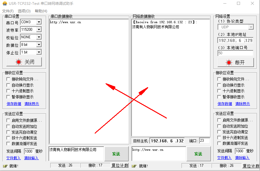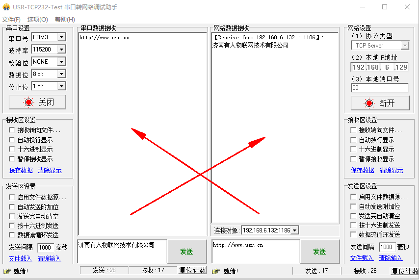 点击连接,有连接对象之后,测试串口和网络之间的数据传输。