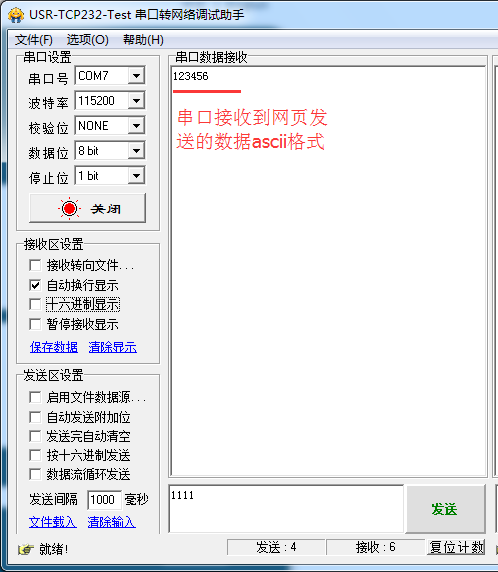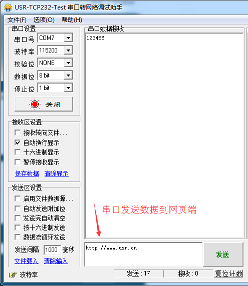 2:从串口端发送数据到WiFi模块网页端。