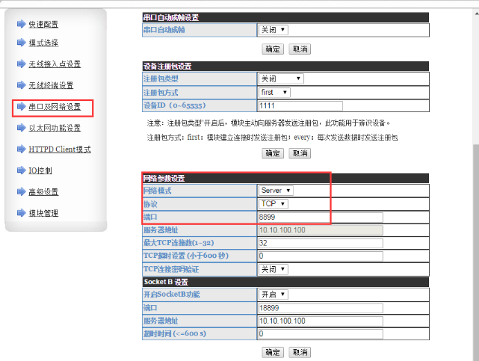 1:进入配置网页10.10.100.254(登录帐号和密码默认为admin),在串口及网络设置中设置网络模式为TCP server,端口8899 。点击确定,重启模块。