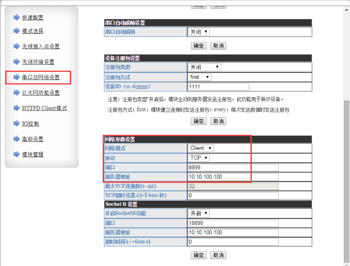 1.修改模块参数为TCP Cilent,服务器地址为测试所用电脑IP10.10.100.100。