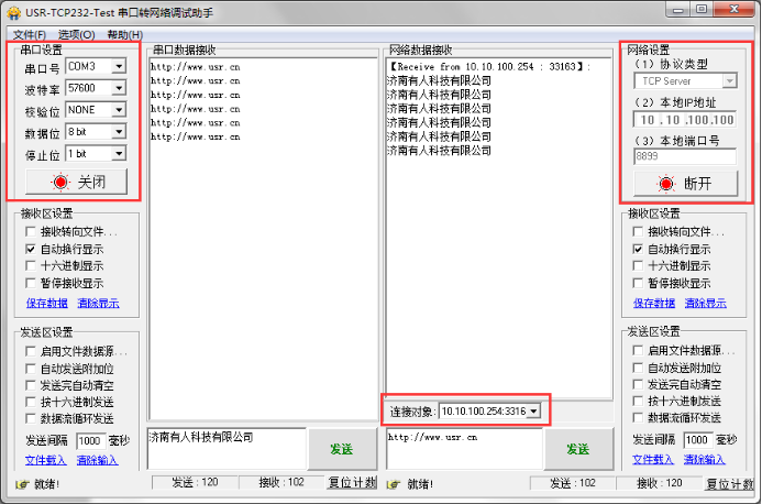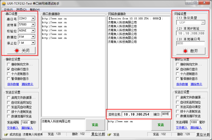 3.通信测试,串口向网络发送及网络向串口发送均可正常收到。